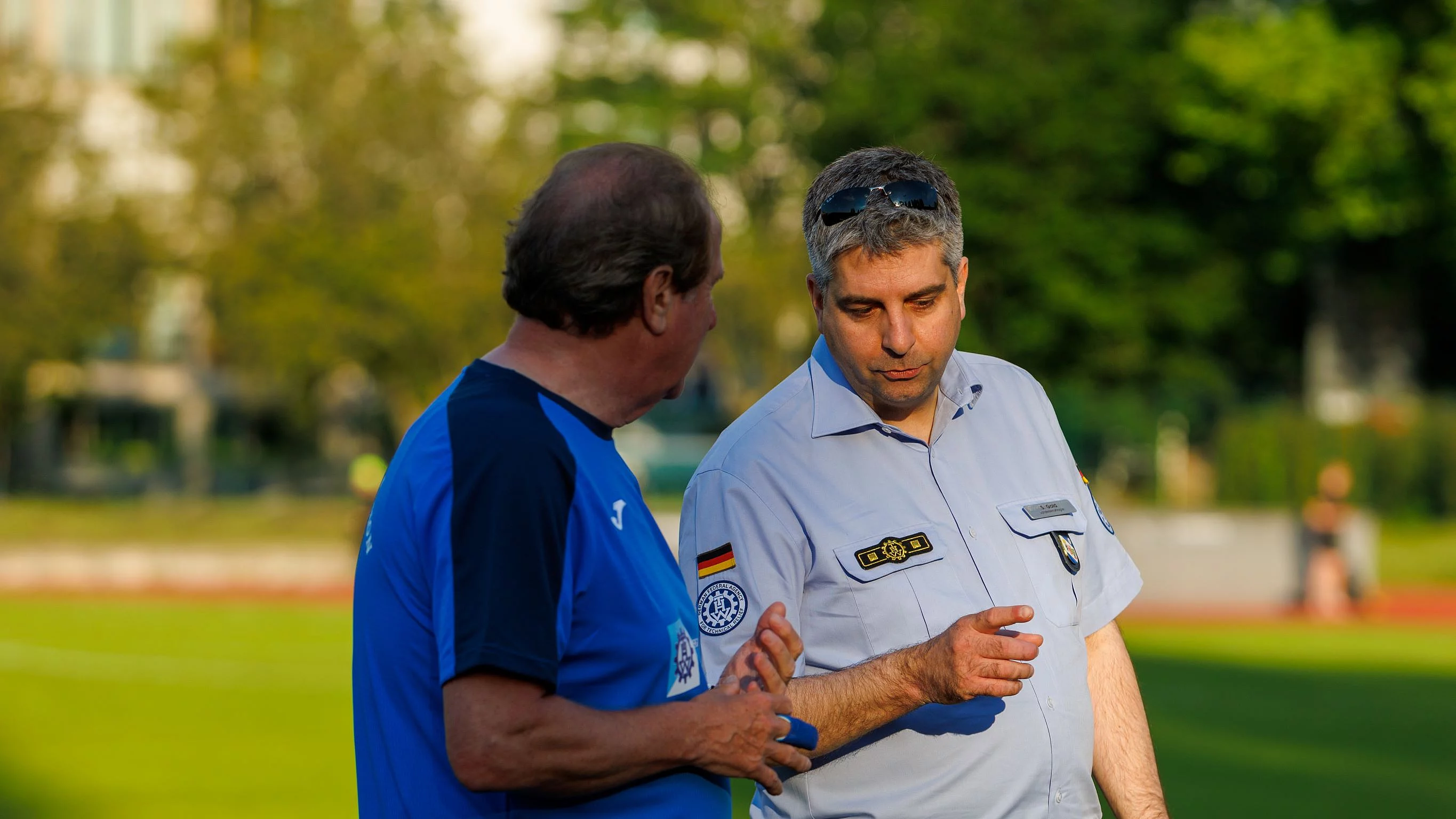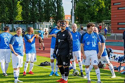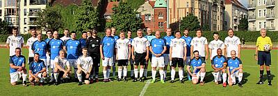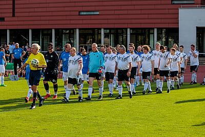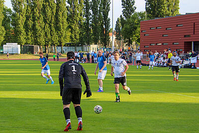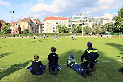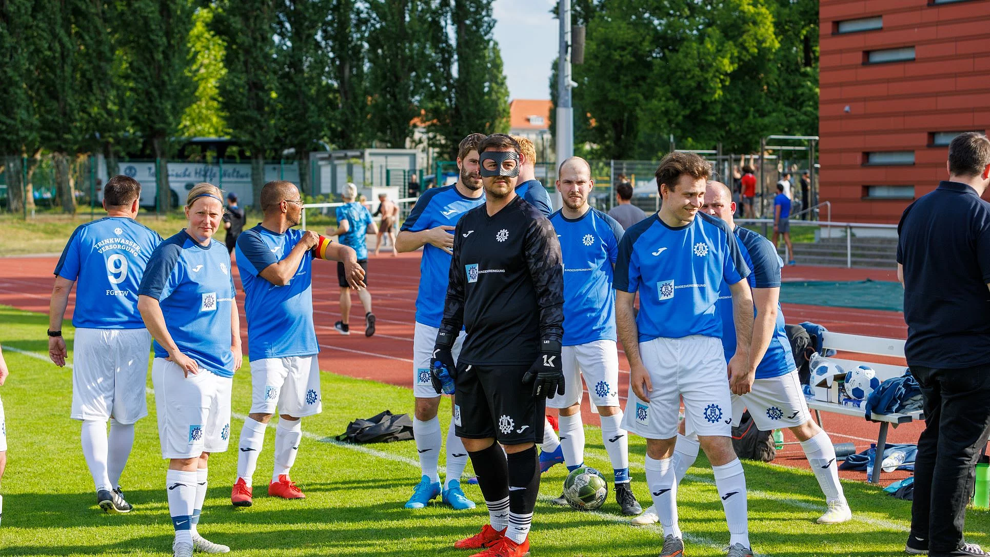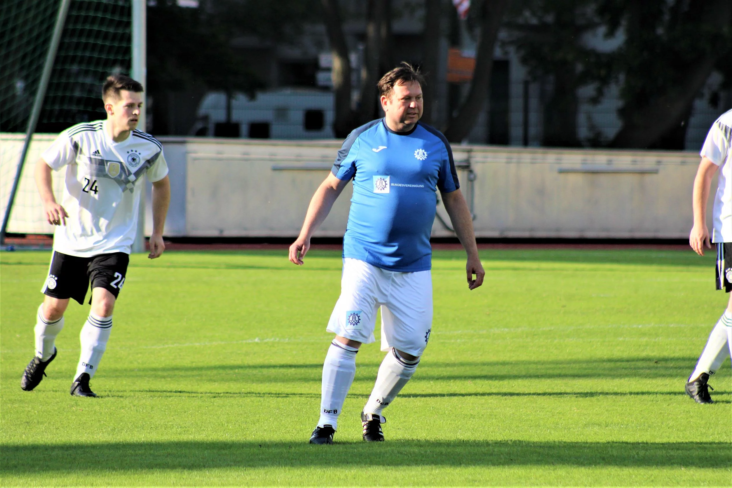 13 Spielerinnen und Spieler aus dem Ehrenamt und genauso viele aus dem Hauptamt trafen sich zum ersten Mal auf dem Rasen. Mittendrin: THW-Präsident Gerd Friedsam. Er hat extra seinen Urlaub unterbrochen, um für das THW auf dem Platz zu stehen. 30 Minuten Auf- und Vorbereitungszeit mussten reichen. Teamarbeit liegt dem THW im Blut und so fand sich die bunt gemischte Mannschaft schnell zusammen und wurde eine eigene Einheit.