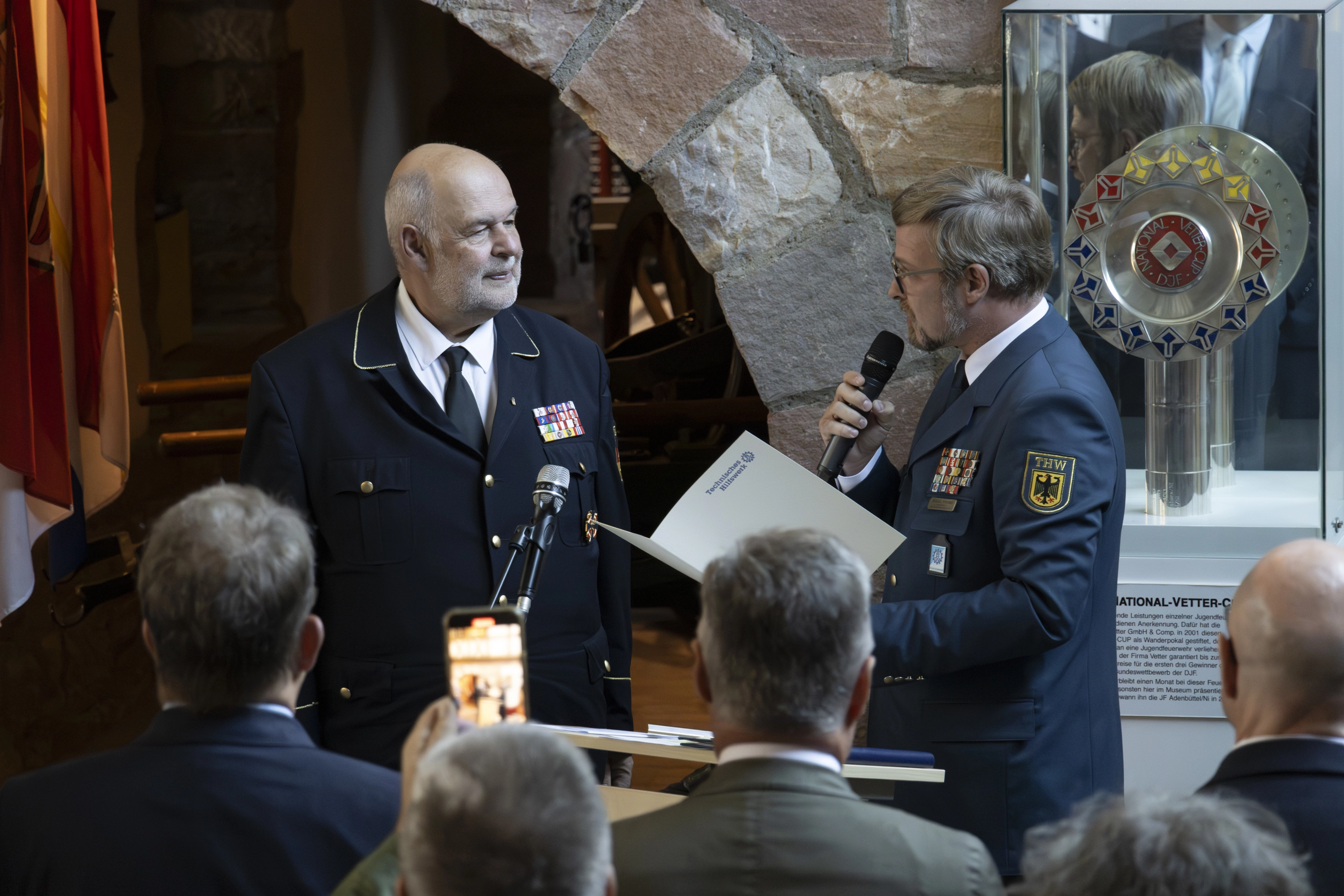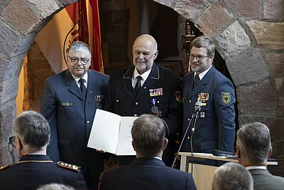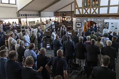 Im Rahmen der Verabschiedung würdigte Christian Herrmann, Bauftragter der THW-historischen Sammlung und Vizepräsident der THW-Bundesvereinigung, Schambergers Engagement, indem er ihm das Ehrenabzeichen der THW-Präsidentin Sabine Lackner verlieh. Diese besondere Auszeichnung unterstreicht die herausragende Leistung Schambergers, der als Beauftragter der THW-historischen Sammlung maßgeblich zur Verwirklichung des gemeinsamen Museums beitrug.